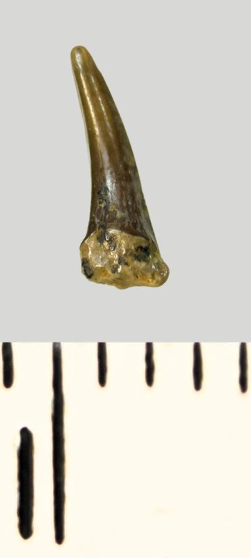 Зуб (фрагмент). Акула. Eostriatolamia subulata (Agassiz, 1843). Классификация: Хордовые Chordata, Позвоночные Vertebrata, Хрящевые рыбы Chondrichthyes, Пластиножаберные Elasmobranchii, Акулы Selachii, Ламнообразные Lamniformes, Песчаные акулы Odontaspididae