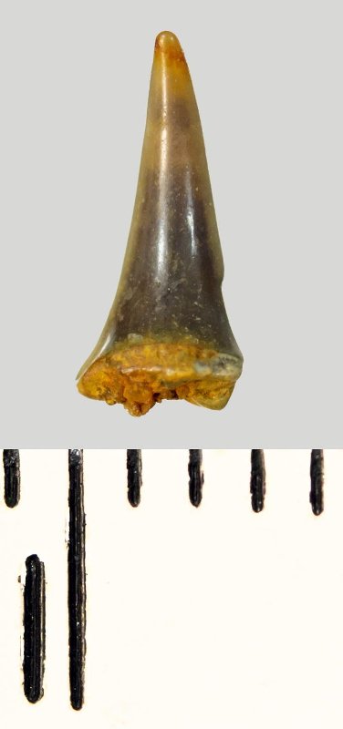 Зуб (фрагмент). Акула. Eostriatolamia subulata (Agassiz, 1843). Классификация: Хордовые Chordata, Позвоночные Vertebrata, Хрящевые рыбы Chondrichthyes, Пластиножаберные Elasmobranchii, Акулы Selachii, Ламнообразные Lamniformes, Песчаные акулы Odontaspididae