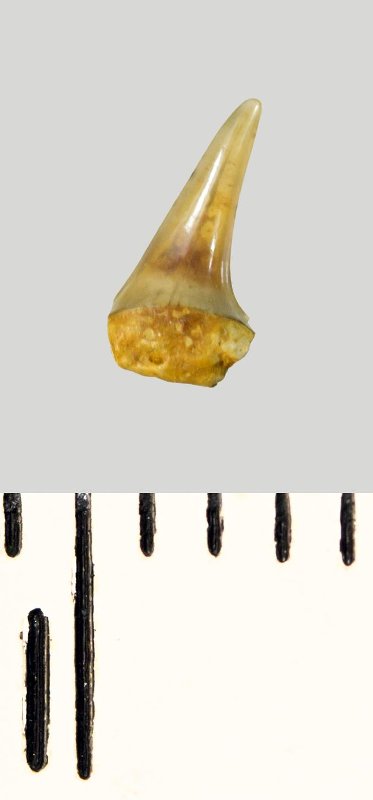 Зуб (фрагмент). Акула. Eostriatolamia subulata (Agassiz, 1843). Классификация: Хордовые Chordata, Позвоночные Vertebrata, Хрящевые рыбы Chondrichthyes, Пластиножаберные Elasmobranchii, Акулы Selachii, Ламнообразные Lamniformes, Песчаные акулы Odontaspididae
