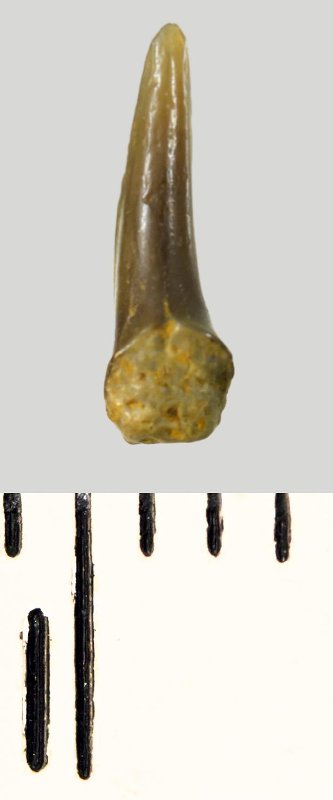 Зуб (фрагмент). Акула. Eostriatolamia subulata (Agassiz, 1843). Классификация: Хордовые Chordata, Позвоночные Vertebrata, Хрящевые рыбы Chondrichthyes, Пластиножаберные Elasmobranchii, Акулы Selachii, Ламнообразные Lamniformes, Песчаные акулы Odontaspididae