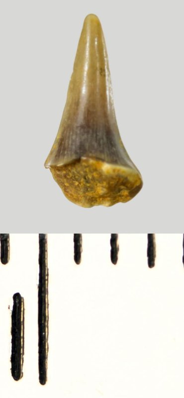Зуб (фрагмент). Акула. Eostriatolamia subulata (Agassiz, 1843). Классификация: Хордовые Chordata, Позвоночные Vertebrata, Хрящевые рыбы Chondrichthyes, Пластиножаберные Elasmobranchii, Акулы Selachii, Ламнообразные Lamniformes, Песчаные акулы Odontaspididae