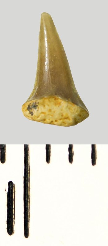 Зуб (фрагмент). Акула. Eostriatolamia subulata (Agassiz, 1843). Классификация: Хордовые Chordata, Позвоночные Vertebrata, Хрящевые рыбы Chondrichthyes, Пластиножаберные Elasmobranchii, Акулы Selachii, Ламнообразные Lamniformes, Песчаные акулы Odontaspididae