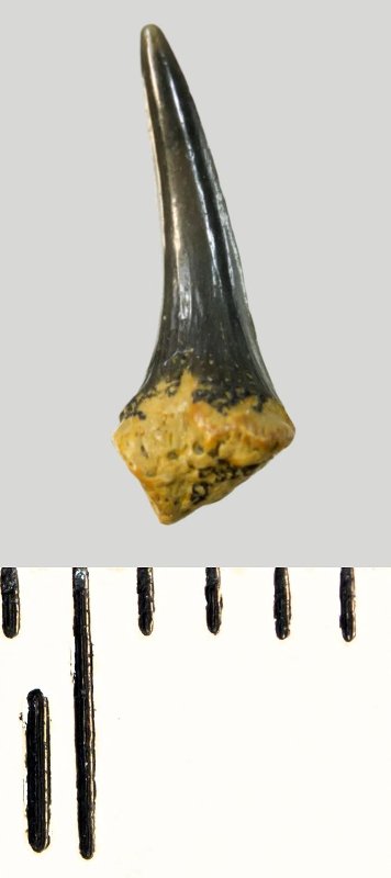 Зуб (фрагмент). Акула. Eostriatolamia subulata (Agassiz, 1843). Классификация: Хордовые Chordata, Позвоночные Vertebrata, Хрящевые рыбы Chondrichthyes, Пластиножаберные Elasmobranchii, Акулы Selachii, Ламнообразные Lamniformes, Песчаные акулы Odontaspididae
