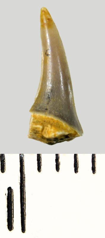 Коронка мелкого бокового зуба серого цвета, колюще-режущего типа, S-образно изогнутая, с гладким режущим краем. С лингвальной стороны у основания коронки на эмали имеется скульптура в виде слабой продольной струйчатости. Корень не сохранился