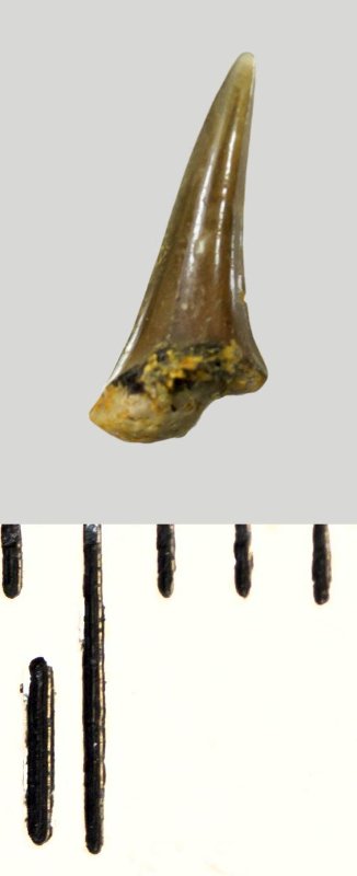 Зуб (фрагмент). Акула. Eostriatolamia subulata (Agassiz, 1843). Классификация: Хордовые Chordata, Позвоночные Vertebrata, Хрящевые рыбы Chondrichthyes, Пластиножаберные Elasmobranchii, Акулы Selachii, Ламнообразные Lamniformes, Песчаные акулы Odontaspididae