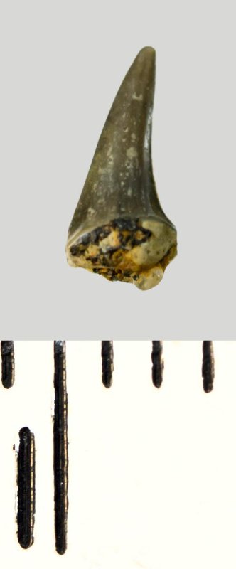 Зуб (фрагмент). Акула. Eostriatolamia subulata (Agassiz, 1843). Классификация: Хордовые Chordata, Позвоночные Vertebrata, Хрящевые рыбы Chondrichthyes, Пластиножаберные Elasmobranchii, Акулы Selachii, Ламнообразные Lamniformes, Песчаные акулы Odontaspididae