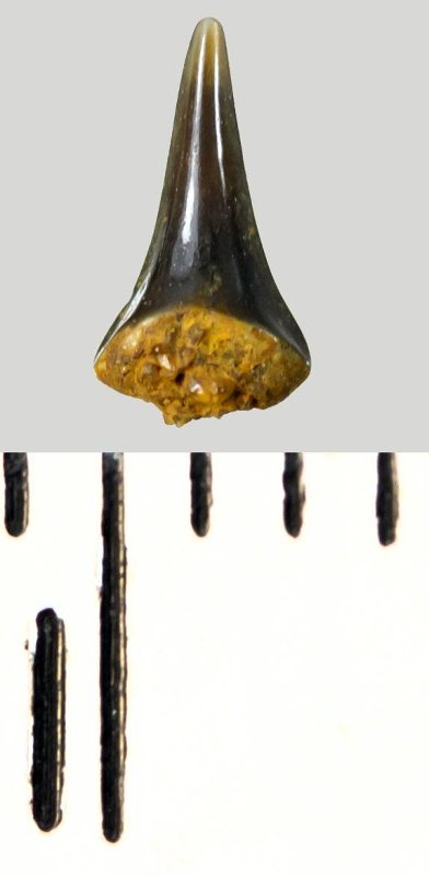 Зуб (фрагмент). Акула. Eostriatolamia subulata (Agassiz, 1843). Классификация: Хордовые Chordata, Позвоночные Vertebrata, Хрящевые рыбы Chondrichthyes, Пластиножаберные Elasmobranchii, Акулы Selachii, Ламнообразные Lamniformes, Песчаные акулы Odontaspididae