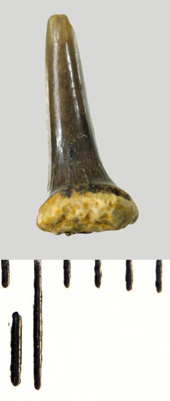 Зуб (фрагмент). Акула. Eostriatolamia subulata (Agassiz, 1843). Классификация: Хордовые Chordata, Позвоночные Vertebrata, Хрящевые рыбы Chondrichthyes, Пластиножаберные Elasmobranchii, Акулы Selachii, Ламнообразные Lamniformes, Песчаные акулы Odontaspididae