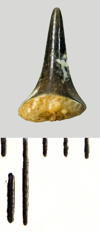 Зуб (фрагмент). Акула. Eostriatolamia subulata (Agassiz, 1843). Классификация: Хордовые Chordata, Позвоночные Vertebrata, Хрящевые рыбы Chondrichthyes, Пластиножаберные Elasmobranchii, Акулы Selachii, Ламнообразные Lamniformes, Песчаные акулы Odontaspididae
