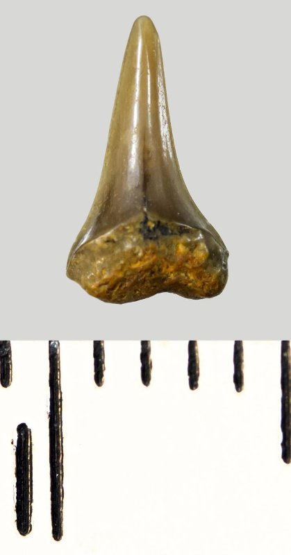 Зуб (фрагмент). Акула. Eostriatolamia subulata (Agassiz, 1843). Классификация: Хордовые Chordata, Позвоночные Vertebrata, Хрящевые рыбы Chondrichthyes, Пластиножаберные Elasmobranchii, Акулы Selachii, Ламнообразные Lamniformes, Песчаные акулы Odontaspididae