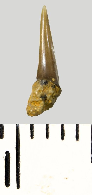Зуб (фрагмент). Акула. Eostriatolamia subulata (Agassiz, 1843). Классификация: Хордовые Chordata, Позвоночные Vertebrata, Хрящевые рыбы Chondrichthyes, Пластиножаберные Elasmobranchii, Акулы Selachii, Ламнообразные Lamniformes, Песчаные акулы Odontaspididae