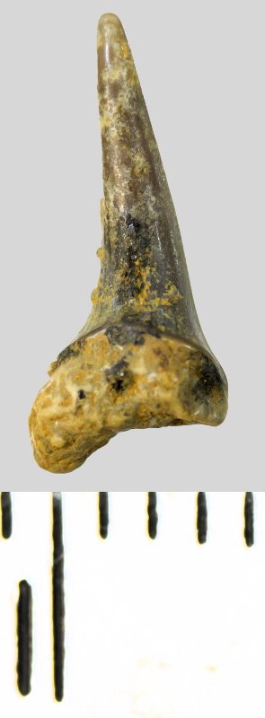 Зуб. Акула. Eostriatolamia subulata (Agassiz, 1843). Классификация: Хордовые Chordata, Позвоночные Vertebrata, Хрящевые рыбы Chondrichthyes, Пластиножаберные Elasmobranchii, Акулы Selachii, Ламнообразные Lamniformes, Песчаные акулы Odontaspididae