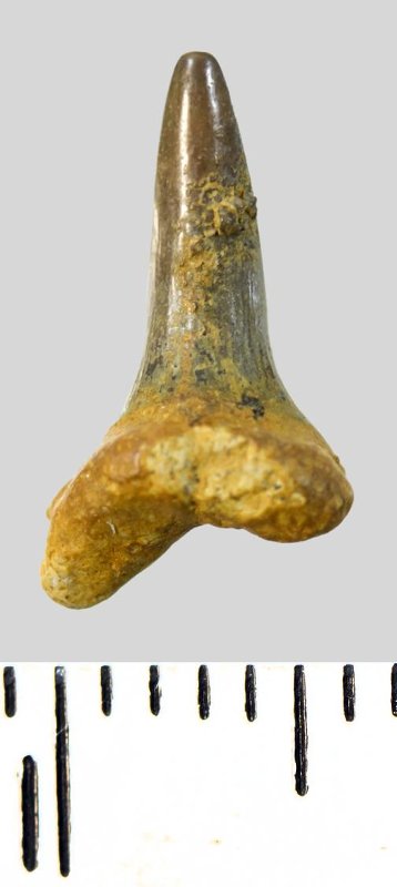 Зуб. Акула. Eostriatolamia subulata (Agassiz, 1843). Классификация: Хордовые Chordata, Позвоночные Vertebrata, Хрящевые рыбы Chondrichthyes, Пластиножаберные Elasmobranchii, Акулы Selachii, Ламнообразные Lamniformes, Песчаные акулы Odontaspididae