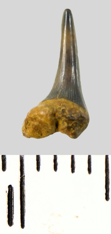 Зуб. Акула. Eostriatolamia subulata (Agassiz, 1843). Классификация: Хордовые Chordata, Позвоночные Vertebrata, Хрящевые рыбы Chondrichthyes, Пластиножаберные Elasmobranchii, Акулы Selachii, Ламнообразные Lamniformes, Песчаные акулы Odontaspididae