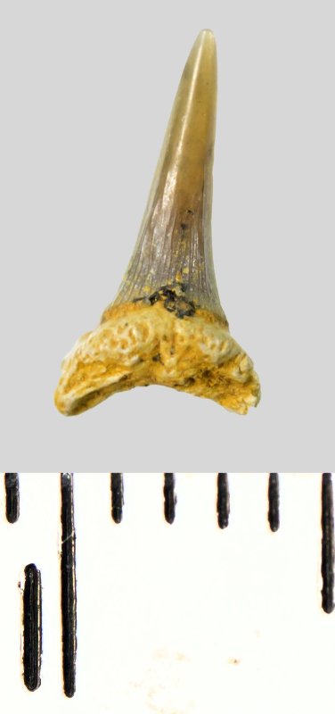 Зуб. Акула. Eostriatolamia subulata (Agassiz, 1843). Классификация: Хордовые Chordata, Позвоночные Vertebrata, Хрящевые рыбы Chondrichthyes, Пластиножаберные Elasmobranchii, Акулы Selachii, Ламнообразные Lamniformes, Песчаные акулы Odontaspididae