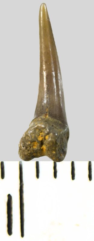 Зуб. Акула. Eostriatolamia subulata (Agassiz, 1843). Классификация: Хордовые Chordata, Позвоночные Vertebrata, Хрящевые рыбы Chondrichthyes, Пластиножаберные Elasmobranchii, Акулы Selachii, Ламнообразные Lamniformes, Песчаные акулы Odontaspididae