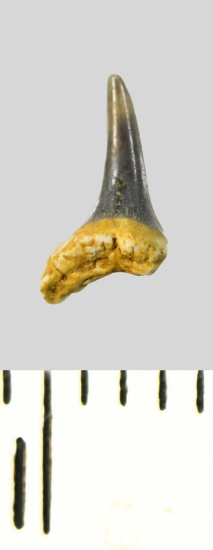 Зуб. Акула. Eostriatolamia subulata (Agassiz, 1843). Классификация: Хордовые Chordata, Позвоночные Vertebrata, Хрящевые рыбы Chondrichthyes, Пластиножаберные Elasmobranchii, Акулы Selachii, Ламнообразные Lamniformes, Песчаные акулы Odontaspididae
