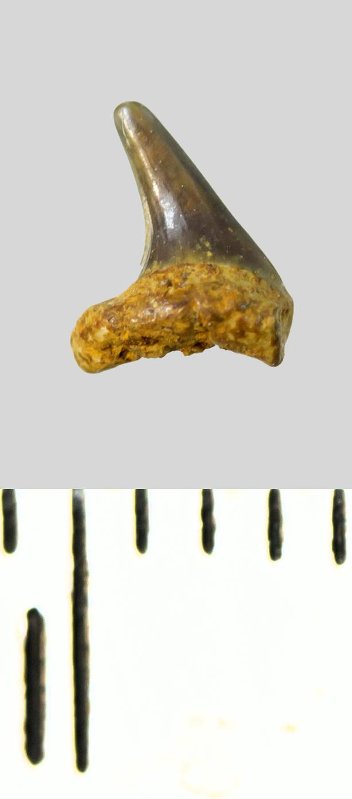 Зуб. Акула. Eostriatolamia subulata (Agassiz, 1843). Классификация: Хордовые Chordata, Позвоночные Vertebrata, Хрящевые рыбы Chondrichthyes, Пластиножаберные Elasmobranchii, Акулы Selachii, Ламнообразные Lamniformes, Песчаные акулы Odontaspididae