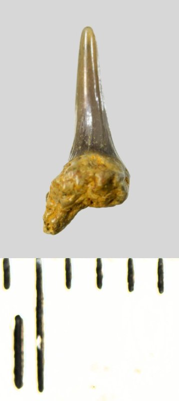 Зуб. Акула. Eostriatolamia subulata (Agassiz, 1843). Классификация: Хордовые Chordata, Позвоночные Vertebrata, Хрящевые рыбы Chondrichthyes, Пластиножаберные Elasmobranchii, Акулы Selachii, Ламнообразные Lamniformes, Песчаные акулы Odontaspididae