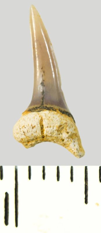 Мелкий боковой зуб с коронкой серого цвета, колюще-режущего типа, S-образно изогнутой, с гладким режущим краем. С лингвальной стороны у основания коронки на эмали имеется скульптура в виде слабой продольной струйчатости. Корень охристый, арочный, умеренно массивный, со следами окатанности. Имеется одна питательная борозда с лингвальной стороны корня. Добавочные зубцы коронки зуба отсутствуют.