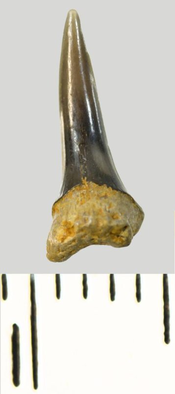 Мелкий боковой зуб с коронкой серого цвета, колюще-режущего типа, S-образно изогнутой, с гладким режущим краем. С лингвальной стороны у основания коронки на эмали имеется скульптура в виде слабой продольной струйчатости. Корень охристый, арочный, умеренно массивный, со следами окатанности. Имеется одна питательная борозда с лингвальной стороны корня. Добавочные зубцы коронки зуба отсутствуют.