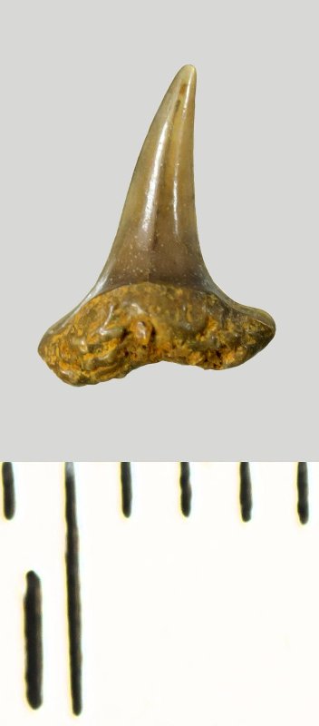 Мелкий боковой зуб с коронкой серого цвета, колюще-режущего типа, S-образно изогнутой, с гладким режущим краем. С лингвальной стороны у основания коронки на эмали имеется скульптура в виде слабой продольной струйчатости. Корень охристый, арочный, умеренно массивный, со следами окатанности. Имеется одна питательная борозда с лингвальной стороны корня. Добавочные зубцы коронки зуба отсутствуют.