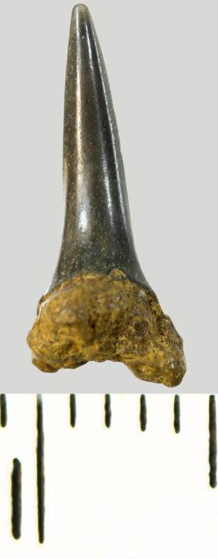 Мелкий боковой зуб с коронкой серого цвета, колюще-режущего типа, S-образно изогнутой, с гладким режущим краем. С лингвальной стороны у основания коронки на эмали имеется скульптура в виде слабой продольной струйчатости. Корень охристый, арочный, умеренно массивный, со следами окатанности. Имеется одна питательная борозда с лингвальной стороны корня. Добавочные зубцы коронки зуба отсутствуют.