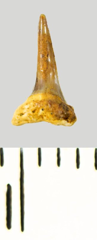Мелкий боковой зуб с коронкой серого цвета, колюще-режущего типа, S-образно изогнутой, с гладким режущим краем. С лингвальной стороны у основания коронки на эмали имеется скульптура в виде слабой продольной струйчатости. Корень охристый, арочный, умеренно массивный, со следами окатанности. Имеется одна питательная борозда с лингвальной стороны корня. Добавочные зубцы коронки зуба отсутствуют.