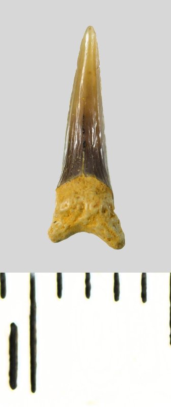 Мелкий боковой зуб с коронкой серого цвета, колюще-режущего типа, S-образно изогнутой, с гладким режущим краем. С лингвальной стороны у основания коронки на эмали имеется скульптура в виде слабой продольной струйчатости. Корень охристый, арочный, умеренно массивный, со следами окатанности. Имеется одна питательная борозда с лингвальной стороны корня. Добавочные зубцы коронки зуба отсутствуют.