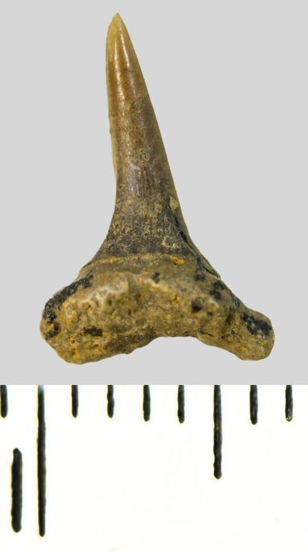 Мелкий боковой зуб с коронкой серого цвета, колюще-режущего типа, S-образно изогнутой, с гладким режущим краем. С лингвальной стороны у основания коронки на эмали имеется скульптура в виде слабой продольной струйчатости. Корень охристый, арочный, умеренно массивный, со следами окатанности. Имеется одна питательная борозда с лингвальной стороны корня. Добавочные зубцы коронки зуба отсутствуют.