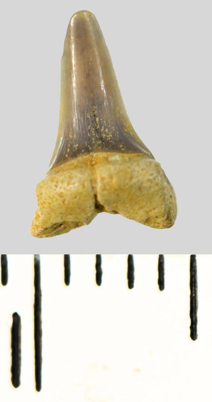 Мелкий боковой зуб с коронкой серого цвета, колюще-режущего типа, S-образно изогнутой, с гладким режущим краем. С лингвальной стороны у основания коронки на эмали имеется скульптура в виде слабой продольной струйчатости. Корень охристый, арочный, умеренно массивный, со следами окатанности. Имеется одна питательная борозда с лингвальной стороны корня. Добавочные зубцы коронки зуба отсутствуют.
