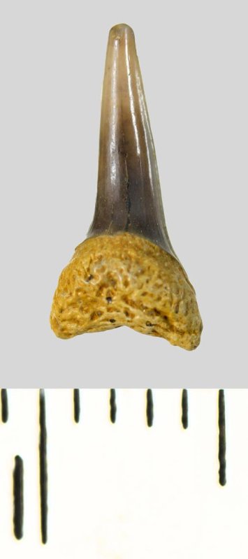 Мелкий боковой зуб с коронкой серого цвета, колюще-режущего типа, S-образно изогнутой, с гладким режущим краем. С лингвальной стороны у основания коронки на эмали имеется скульптура в виде слабой продольной струйчатости. Корень охристый, арочный, умеренно массивный, со следами окатанности. Имеется одна питательная борозда с лингвальной стороны корня. Добавочные зубцы коронки зуба отсутствуют.