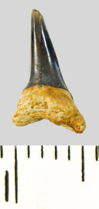 Мелкий боковой зуб с коронкой серого цвета, колюще-режущего типа, S-образно изогнутой, с гладким режущим краем. С лингвальной стороны у основания коронки на эмали имеется скульптура в виде слабой продольной струйчатости. Корень охристый, арочный, умеренно массивный, со следами окатанности. Имеется одна питательная борозда с лингвальной стороны корня. Добавочные зубцы коронки зуба отсутствуют.