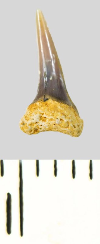 Мелкий боковой зуб с коронкой серого цвета, колюще-режущего типа, S-образно изогнутой, с гладким режущим краем. С лингвальной стороны у основания коронки на эмали имеется скульптура в виде слабой продольной струйчатости. Корень охристый, арочный, умеренно массивный, со следами окатанности. Имеется одна питательная борозда с лингвальной стороны корня. Добавочные зубцы коронки зуба отсутствуют.