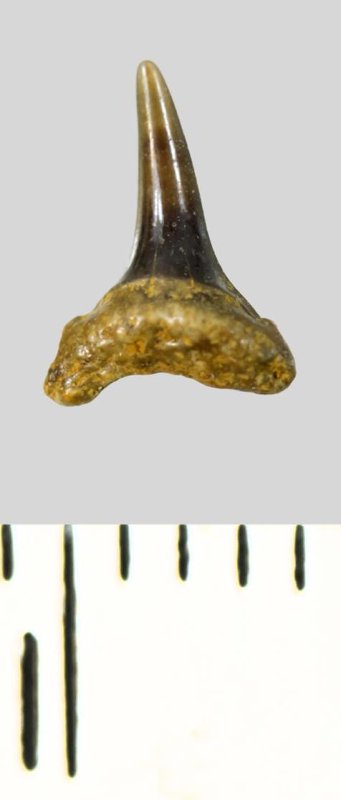 Мелкий боковой зуб с коронкой серого цвета, колюще-режущего типа, S-образно изогнутой, с гладким режущим краем. С лингвальной стороны у основания коронки на эмали имеется скульптура в виде слабой продольной струйчатости. Корень охристый, арочный, умеренно массивный, со следами окатанности. Имеется одна питательная борозда с лингвальной стороны корня. Добавочные зубцы коронки зуба отсутствуют.