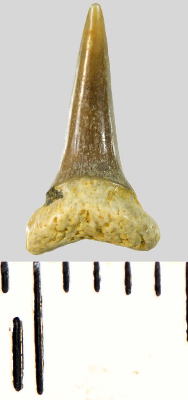 Мелкий боковой зуб с коронкой серого цвета, колюще-режущего типа, S-образно изогнутой, с гладким режущим краем. С лингвальной стороны у основания коронки на эмали имеется скульптура в виде слабой продольной струйчатости. Корень охристый, арочный, умеренно массивный, со следами окатанности. Имеется одна питательная борозда с лингвальной стороны корня. Добавочные зубцы коронки зуба отсутствуют.