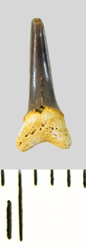 Мелкий боковой зуб с коронкой серого цвета, колюще-режущего типа, S-образно изогнутой, с гладким режущим краем. С лингвальной стороны у основания коронки на эмали имеется скульптура в виде слабой продольной струйчатости. Корень охристый, арочный, умеренно массивный, со следами окатанности. Имеется одна питательная борозда с лингвальной стороны корня. Добавочные зубцы коронки зуба отсутствуют.