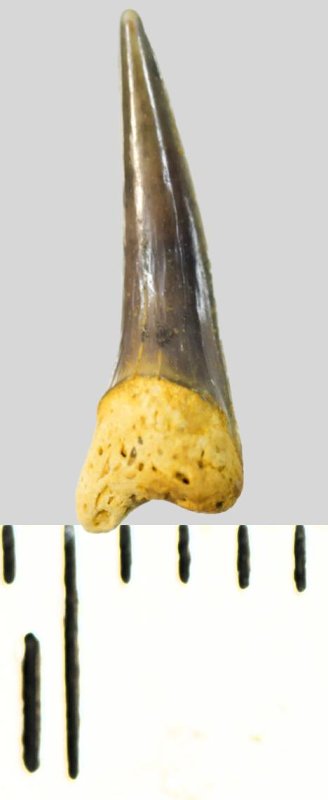 Мелкий боковой зуб с коронкой серого цвета, колюще-режущего типа, S-образно изогнутой, с гладким режущим краем. С лингвальной стороны у основания коронки на эмали имеется скульптура в виде слабой продольной струйчатости. Корень охристый, арочный, умеренно массивный, со следами окатанности. Имеется одна питательная борозда с лингвальной стороны корня. Добавочные зубцы коронки зуба отсутствуют.