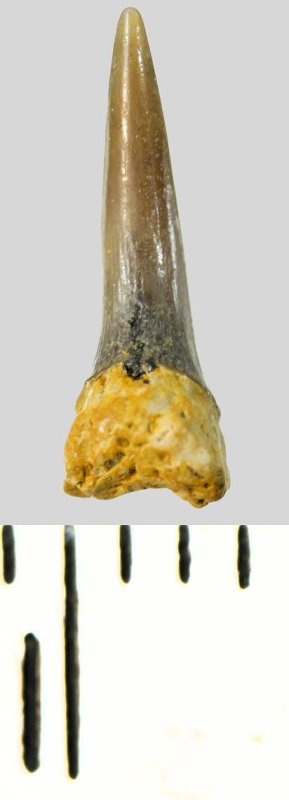 Мелкий боковой зуб с коронкой серого цвета, колюще-режущего типа, S-образно изогнутой, с гладким режущим краем. С лингвальной стороны у основания коронки на эмали имеется скульптура в виде слабой продольной струйчатости. Корень охристый, арочный, умеренно массивный, со следами окатанности. Имеется одна питательная борозда с лингвальной стороны корня. Добавочные зубцы коронки зуба отсутствуют.