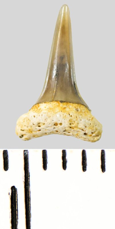 Мелкий боковой зуб с коронкой серого цвета, колюще-режущего типа, S-образно изогнутой, с гладким режущим краем. С лингвальной стороны у основания коронки на эмали имеется скульптура в виде слабой продольной струйчатости. Корень охристый, арочный, умеренно массивный, со следами окатанности. Имеется одна питательная борозда с лингвальной стороны корня. Добавочные зубцы коронки зуба отсутствуют.
