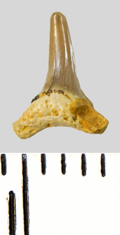 Мелкий боковой зуб с коронкой серого цвета, колюще-режущего типа, S-образно изогнутой, с гладким режущим краем. С лингвальной стороны у основания коронки на эмали имеется скульптура в виде слабой продольной струйчатости. Корень охристый, арочный, умеренно массивный, со следами окатанности. Имеется одна питательная борозда с лингвальной стороны корня. Добавочные зубцы коронки зуба отсутствуют.
