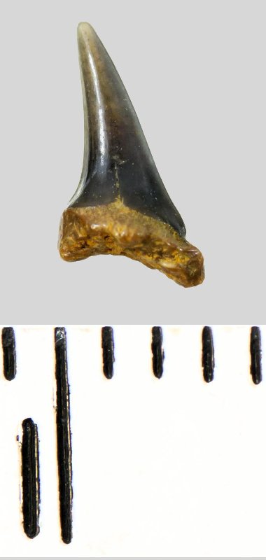 Мелкий боковой зуб с коронкой серого цвета, колюще-режущего типа, S-образно изогнутой, с гладким режущим краем. С лингвальной стороны у основания коронки на эмали имеется скульптура в виде слабой продольной струйчатости. Корень охристый, арочный, умеренно массивный, со следами окатанности. Имеется одна питательная борозда с лингвальной стороны корня. Добавочные зубцы коронки зуба отсутствуют.
