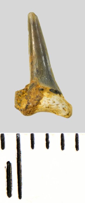 Мелкий боковой зуб с коронкой серого цвета, колюще-режущего типа, S-образно изогнутой, с гладким режущим краем. С лингвальной стороны у основания коронки на эмали имеется скульптура в виде слабой продольной струйчатости. Корень охристый, арочный, умеренно массивный, со следами окатанности. Имеется одна питательная борозда с лингвальной стороны корня. Добавочные зубцы коронки зуба отсутствуют.