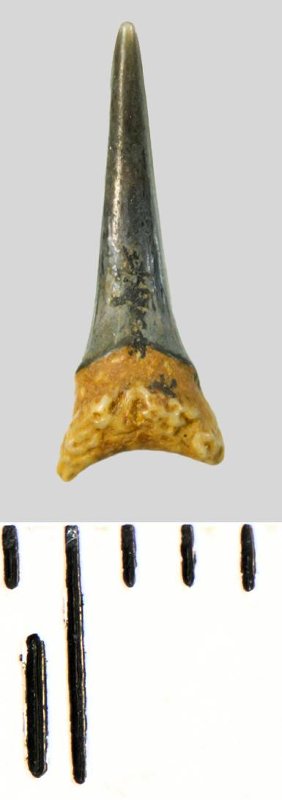 Мелкий боковой зуб с коронкой серого цвета, колюще-режущего типа, S-образно изогнутой, с гладким режущим краем. С лингвальной стороны у основания коронки на эмали имеется скульптура в виде слабой продольной струйчатости. Корень охристый, арочный, умеренно массивный, со следами окатанности. Имеется одна питательная борозда с лингвальной стороны корня. Добавочные зубцы коронки зуба отсутствуют.