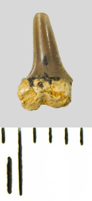 Мелкий боковой зуб с коронкой серого цвета, колюще-режущего типа, S-образно изогнутой, с гладким режущим краем. С лингвальной стороны у основания коронки на эмали имеется скульптура в виде слабой продольной струйчатости. Корень охристый, арочный, умеренно массивный, со следами окатанности. Имеется одна питательная борозда с лингвальной стороны корня. Добавочные зубцы коронки зуба отсутствуют.