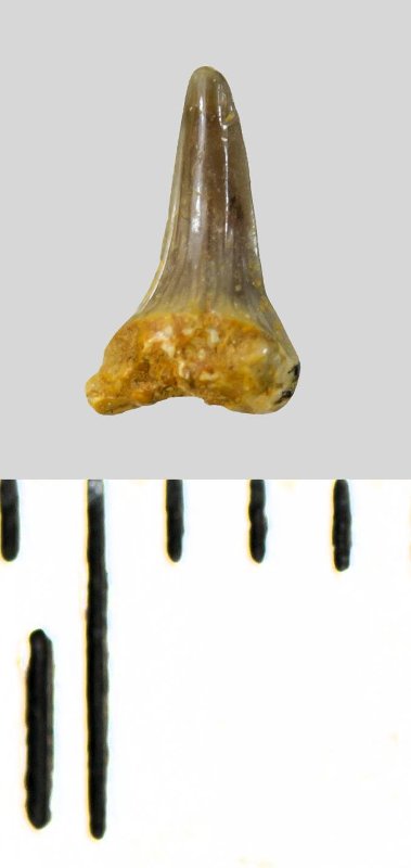 Мелкий боковой зуб с коронкой серого цвета, колюще-режущего типа, S-образно изогнутой, с гладким режущим краем. С лингвальной стороны у основания коронки на эмали имеется скульптура в виде слабой продольной струйчатости. Корень охристый, арочный, умеренно массивный, со следами окатанности. Имеется одна питательная борозда с лингвальной стороны корня. Добавочные зубцы коронки зуба отсутствуют.