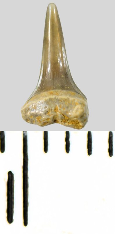 Мелкий боковой зуб с коронкой серого цвета, колюще-режущего типа, S-образно изогнутой, с гладким режущим краем. С лингвальной стороны у основания коронки на эмали имеется скульптура в виде слабой продольной струйчатости. Корень охристый, арочный, умеренно массивный, со следами окатанности. Имеется одна питательная борозда с лингвальной стороны корня. Добавочные зубцы коронки зуба отсутствуют.
