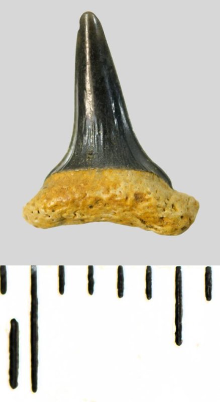 Мелкий боковой зуб с коронкой серого цвета, колюще-режущего типа, S-образно изогнутой, с гладким режущим краем. С лингвальной стороны у основания коронки на эмали имеется скульптура в виде слабой продольной струйчатости. Корень охристый, арочный, умеренно массивный, со следами окатанности. Имеется одна питательная борозда с лингвальной стороны корня. Добавочные зубцы коронки зуба отсутствуют.