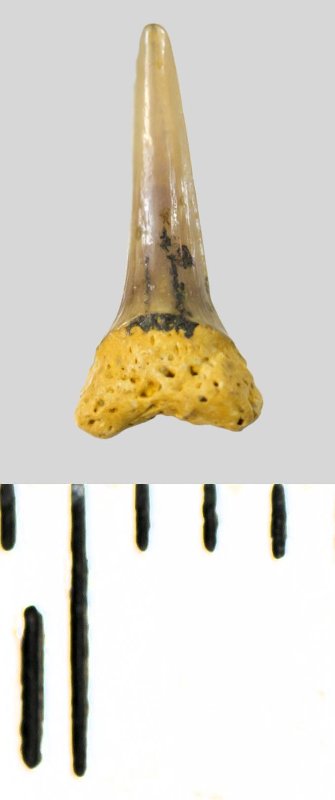 Мелкий боковой зуб с коронкой серого цвета, колюще-режущего типа, S-образно изогнутой, с гладким режущим краем. С лингвальной стороны у основания коронки на эмали имеется скульптура в виде слабой продольной струйчатости. Корень охристый, арочный, умеренно массивный, со следами окатанности. Имеется одна питательная борозда с лингвальной стороны корня. Добавочные зубцы коронки зуба отсутствуют.