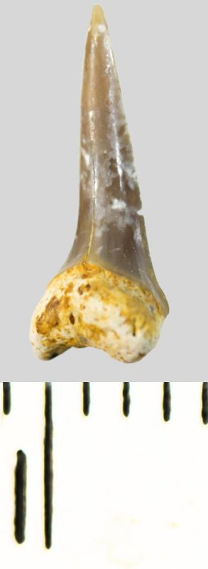 Мелкий боковой зуб с коронкой серого цвета, колюще-режущего типа, S-образно изогнутой, с гладким режущим краем. С лингвальной стороны у основания коронки на эмали имеется скульптура в виде слабой продольной струйчатости. Корень охристый, арочный, умеренно массивный, со следами окатанности. Имеется одна питательная борозда с лингвальной стороны корня. Добавочные зубцы коронки зуба отсутствуют.